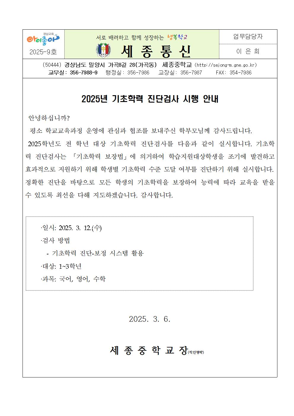 2025년 기초학력 진단검사 시행 안내