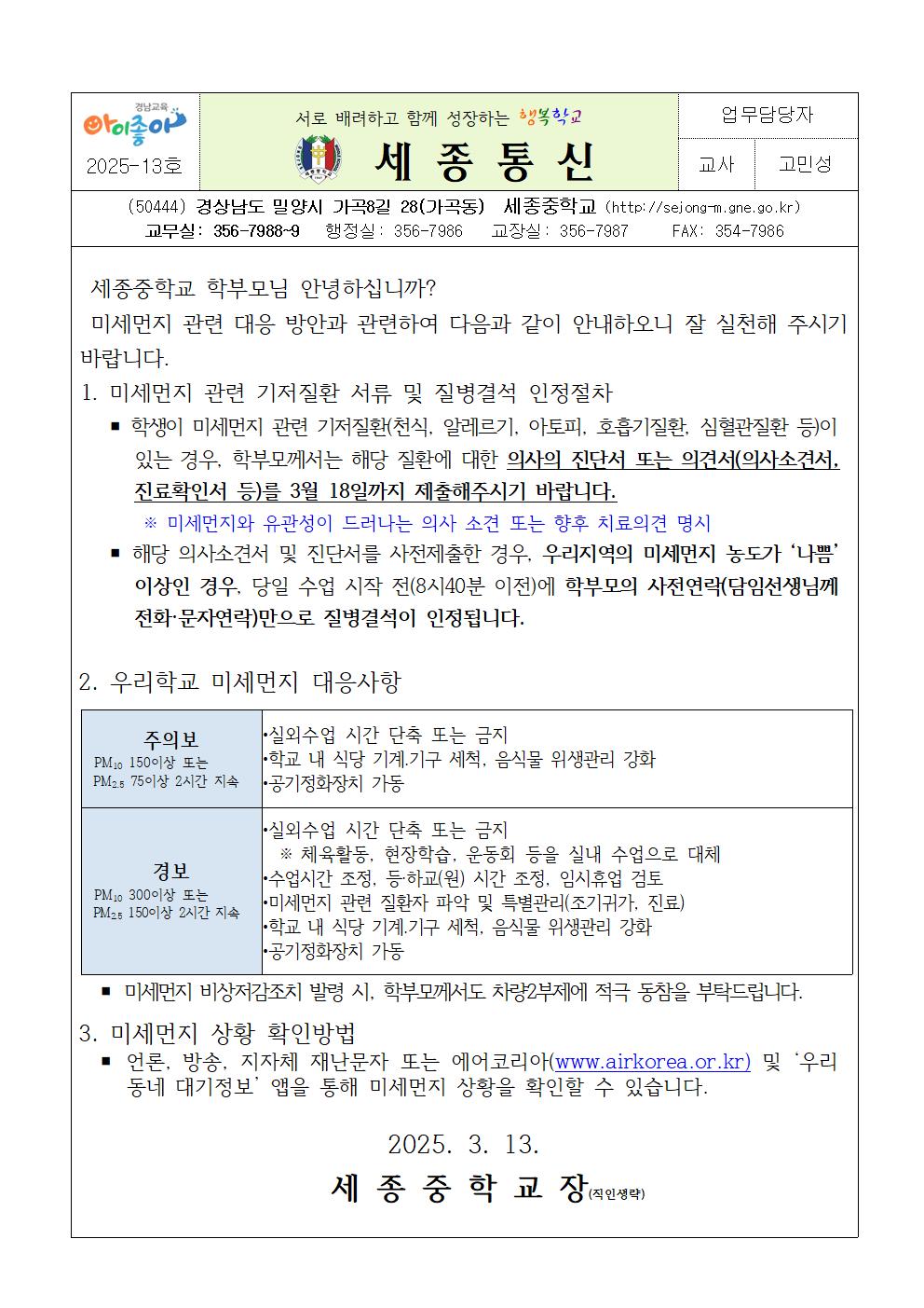미세먼지 관련 질병결석 인정 안내 가정통신문(세종중).pdf