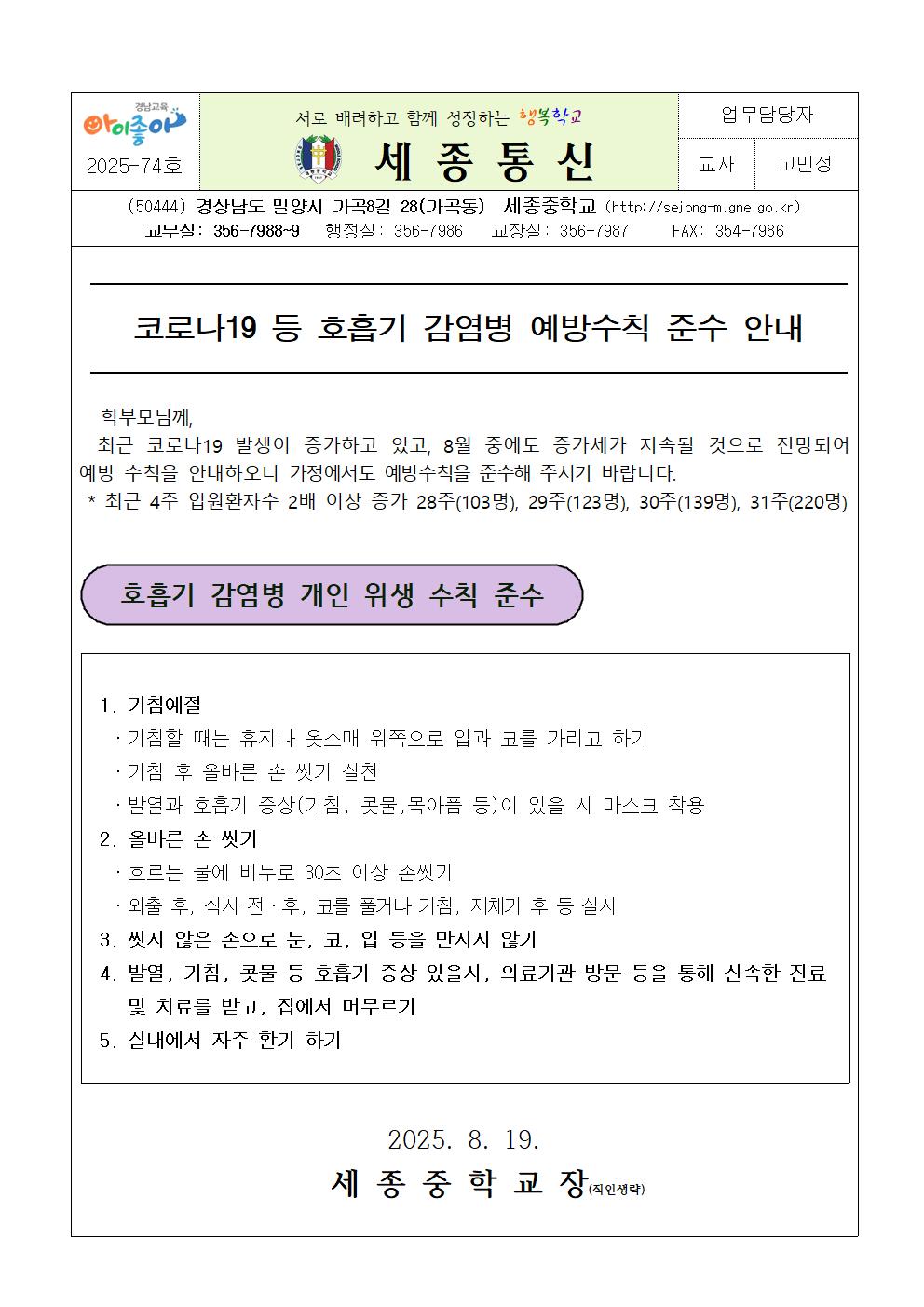 코로나19 등 호흡기 감염병 예방수칙 준수 안내 가정통신문(세종중).pdf