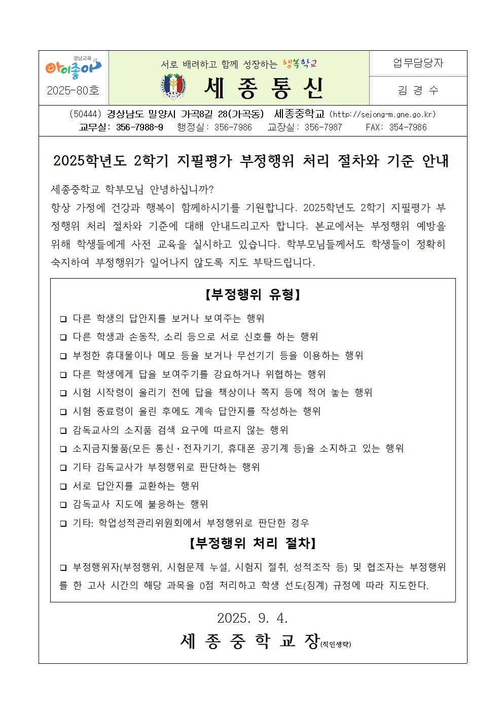 2025학년도 2학기 지필평가 부정행위 처리 절차와 기준 안내